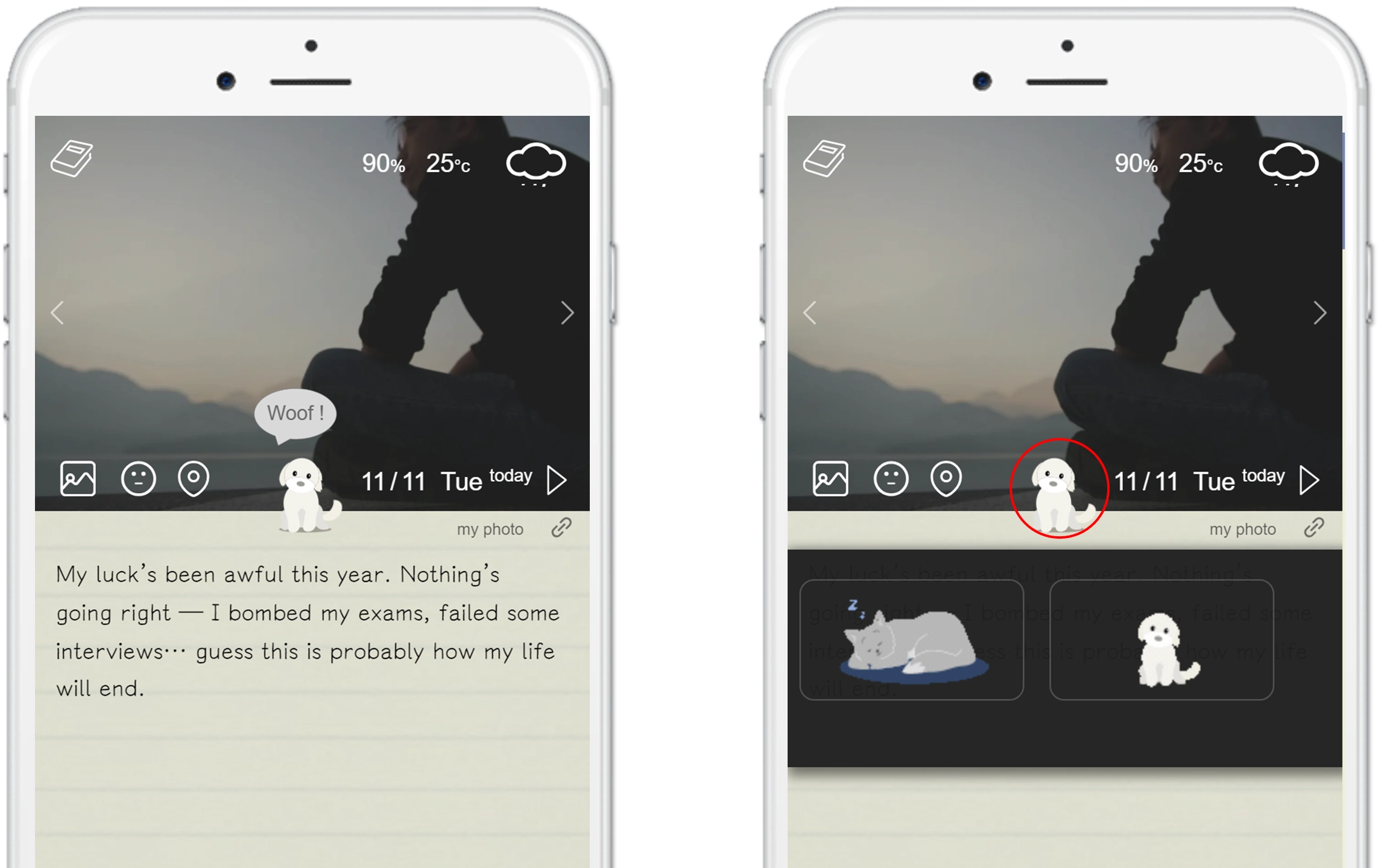 Additionally, if you're using voice input, you can summon your buddy by saying“Hi, buddy”. Once you say that, it will appear.This is an experimental feature — a cute pet appears at the center of the screen to keep you company (uou can switch between a dog and a cat). The pet can sense your mood: when your diary entry becomes emotional, it will respond with a caring "Woof woof woof" (dog) or "Meow meow meow" (cat).