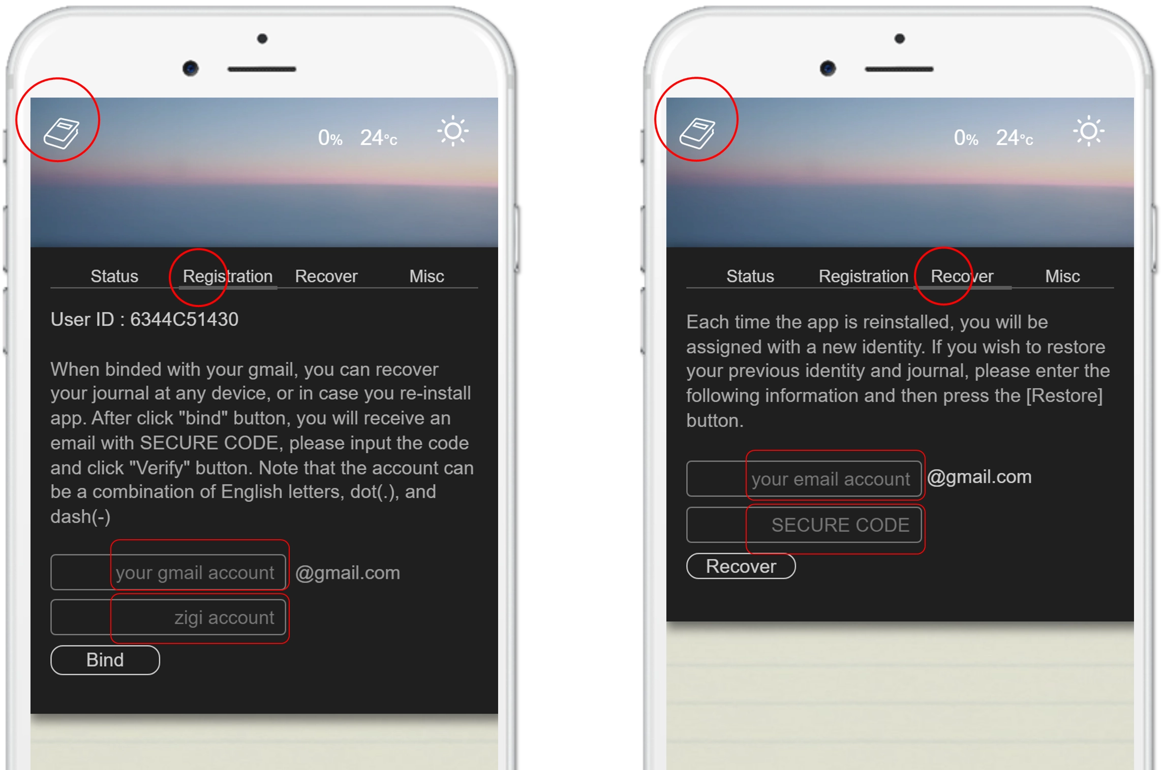 Once Zigi is installed on your home screen, you can use it right away. But what if you switch to a new phone or reinstall the app? How do you restore your previously written entries? That's where the [Register] feature comes in. As long as you've registered before, your journal content can be restored always.First, tap the [Setting] icon in the top-left corner, then switch to the [Registration] section. Enter your email address and your desired account (letters, numbers, and periods only). After tapping [Bind], the system will send a verification email to that address. The email includes a 6-digit security code — enter that code to complete the registration.