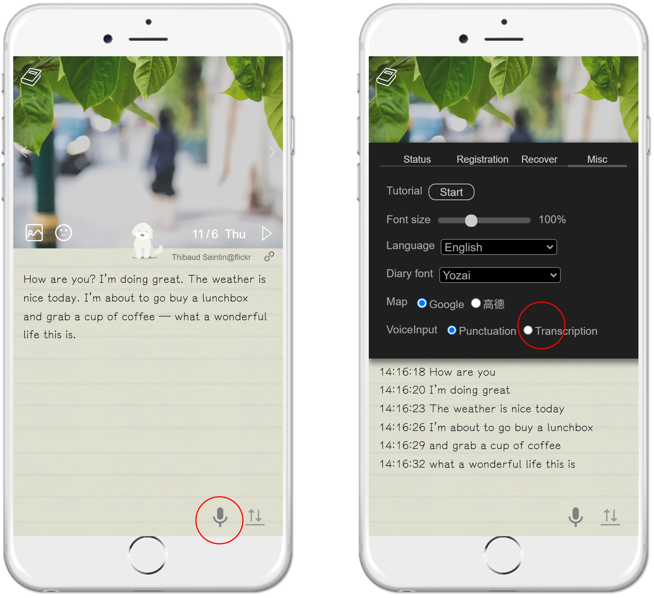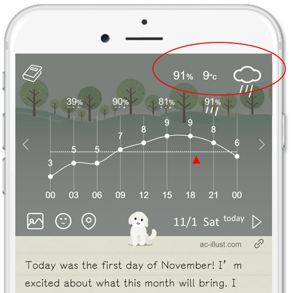 The [Weather information] in the top-right corner shows local {rain probability, current temperature, weather figural}. Having a real-time weather condition while writing, you can feel a sense of immediacy and presence.