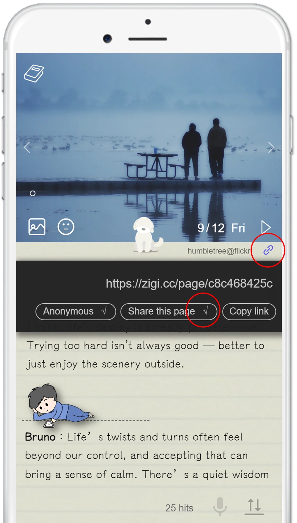 Zigi features one page and one image per day — the image here refers to the “cover image.” The platform currently offers a library of 300 beautifully pictures that users can freely use as covers. Users can also upload their own images — up to 5 per page. The uploaded images are shown as dots, and users can tap the dots to switch between different images as the cover.