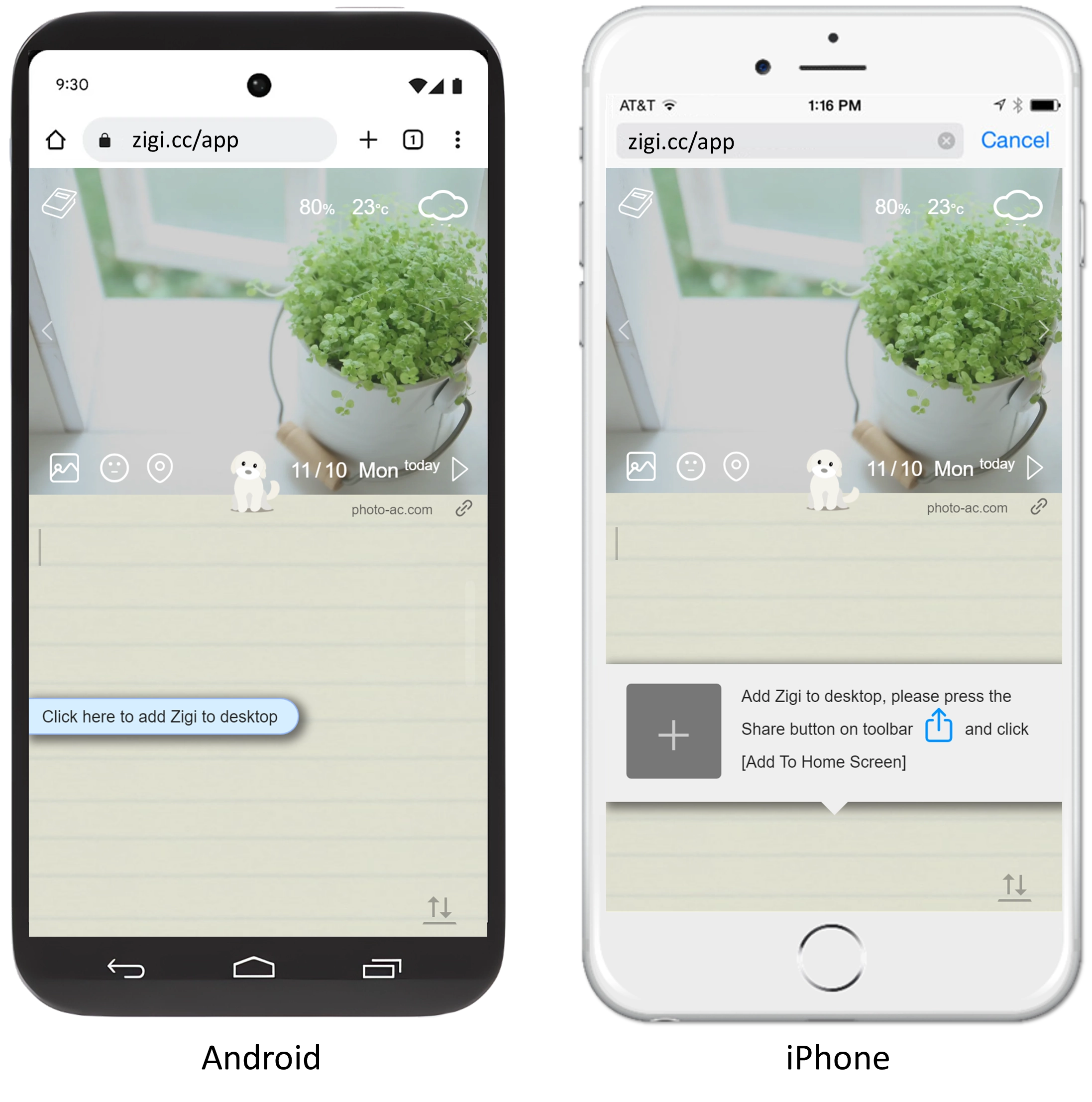 Zigi is a lightweight web app (using Google's Progressive Web App, or PWA, deployment method). It's compact in size and can be installed on iOS, Android, and desktop devices. Here's how:■ Android
